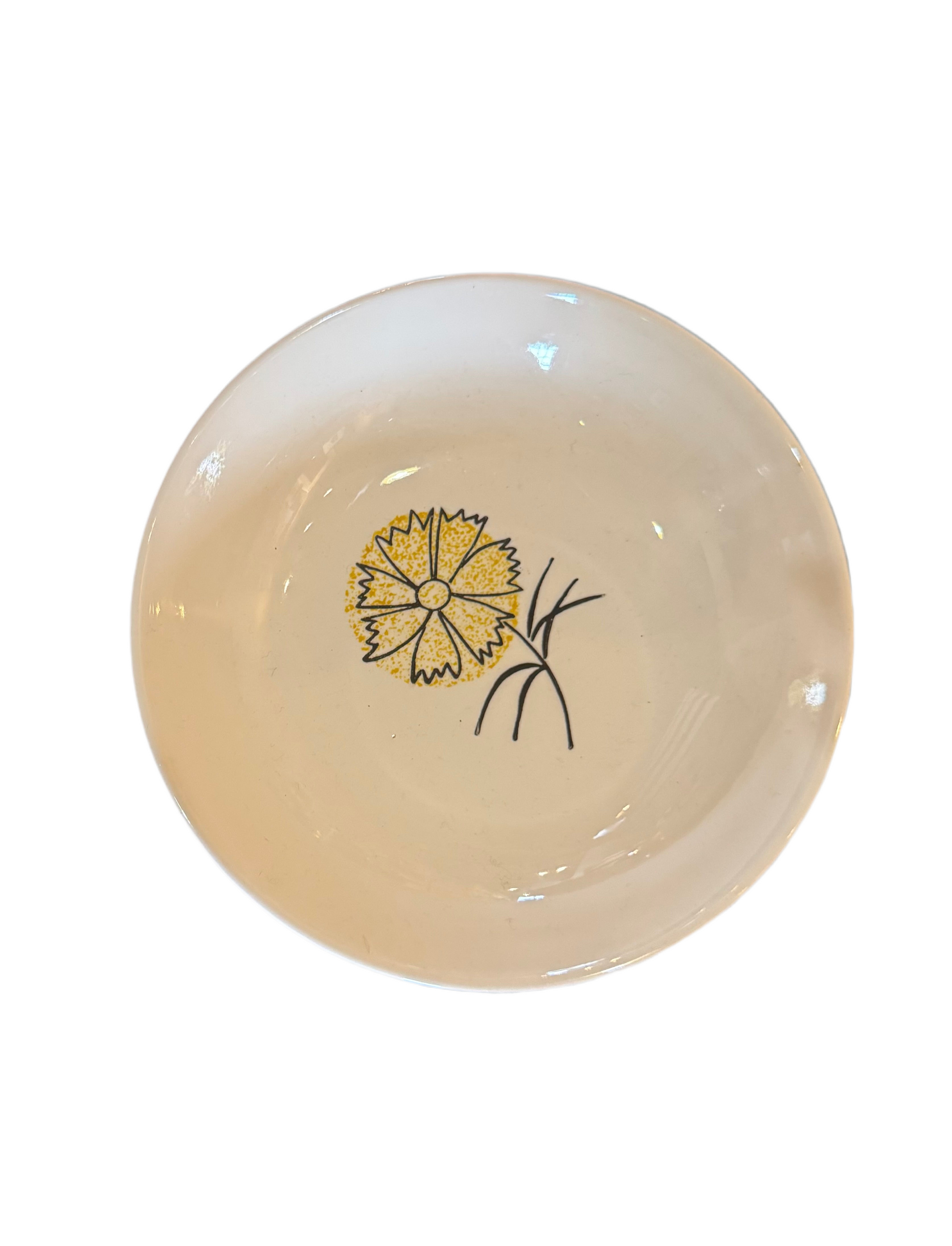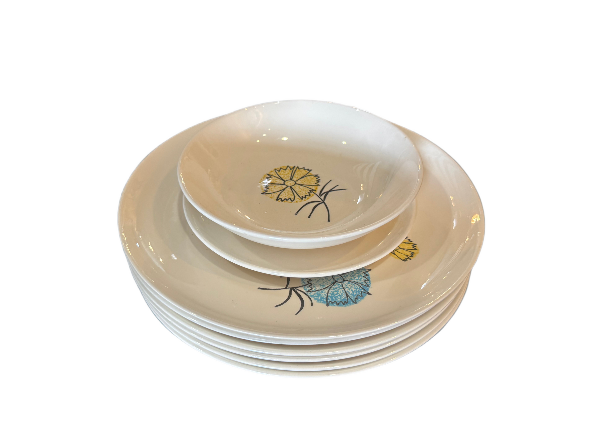 Set of vintage floral patterned 6 plates and 6 bowls. Colors range from pale yellow, pale blue, and pale pink with black details on a white ground. 1950's.