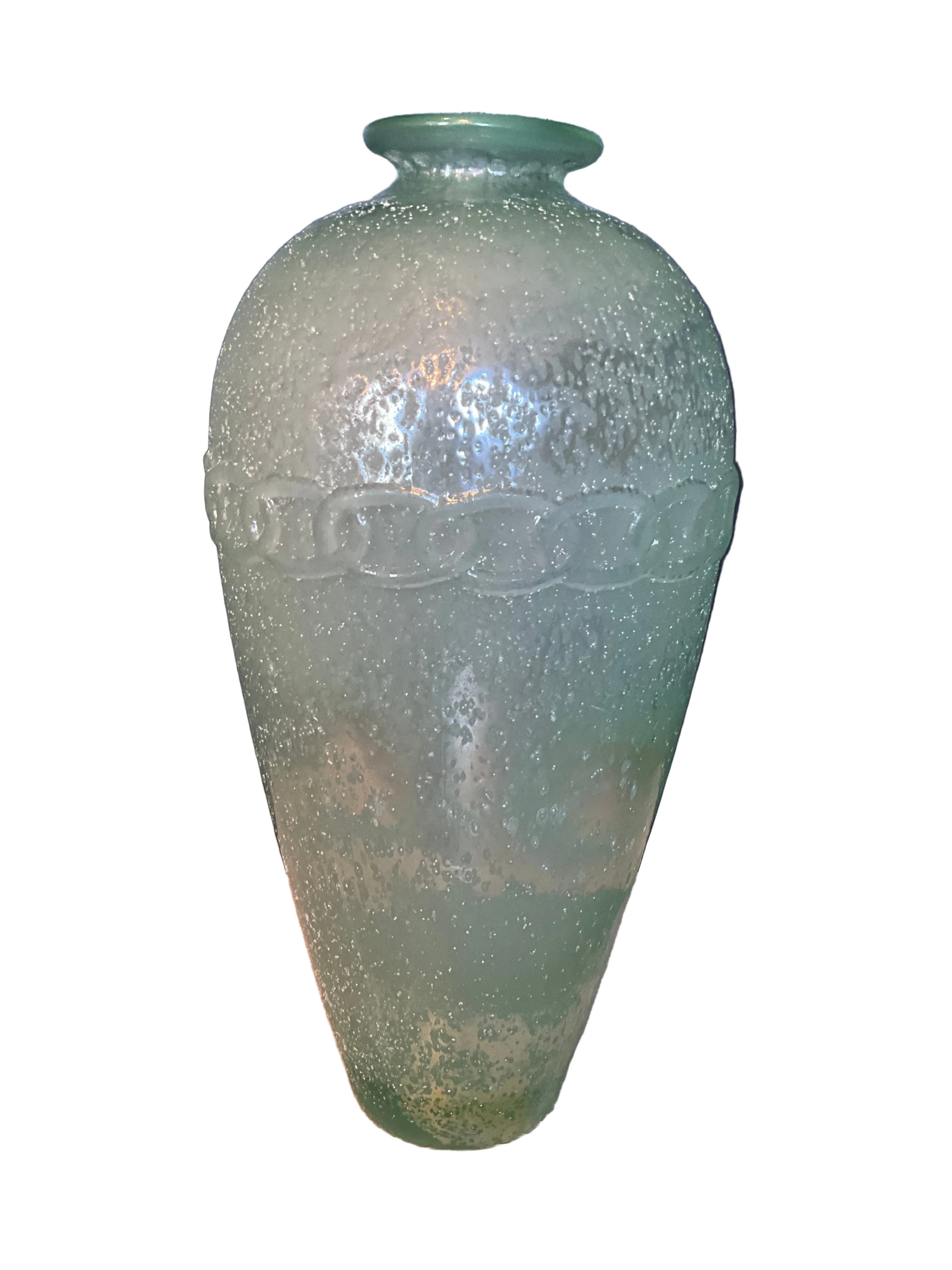 green glass vase with a "chipped ice" or "scavo" finish, which gives it a frosted, textured appearance. The vase has a band of raised, chain-like decoration around its widest part