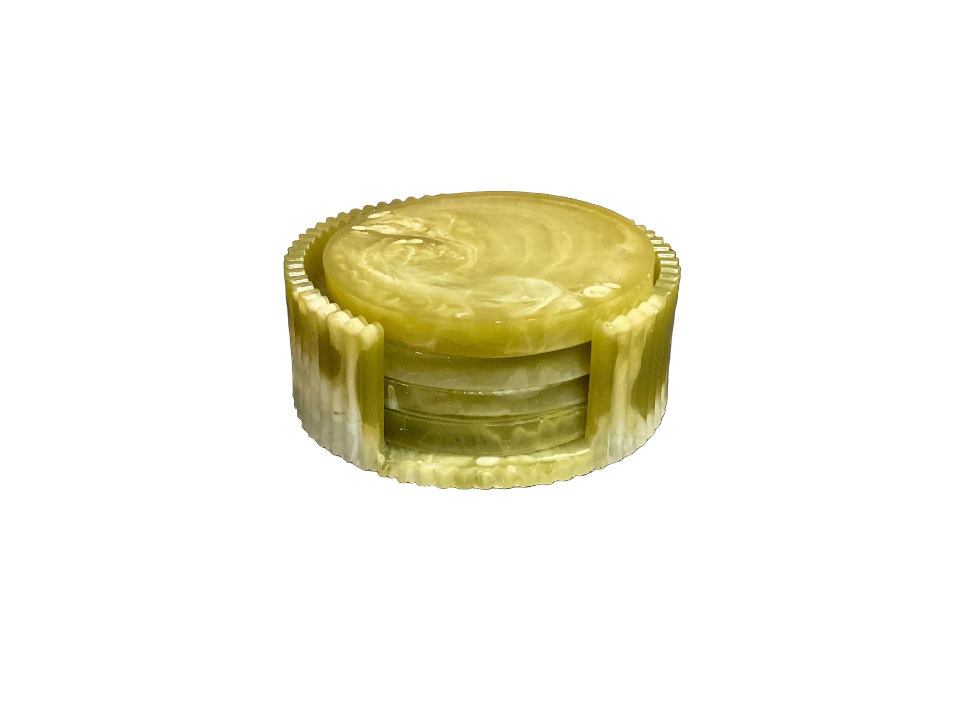 Marbleized resin coasters with a fluted holder. Hand wash with dawn dish soap and warm water. Heat resistant.