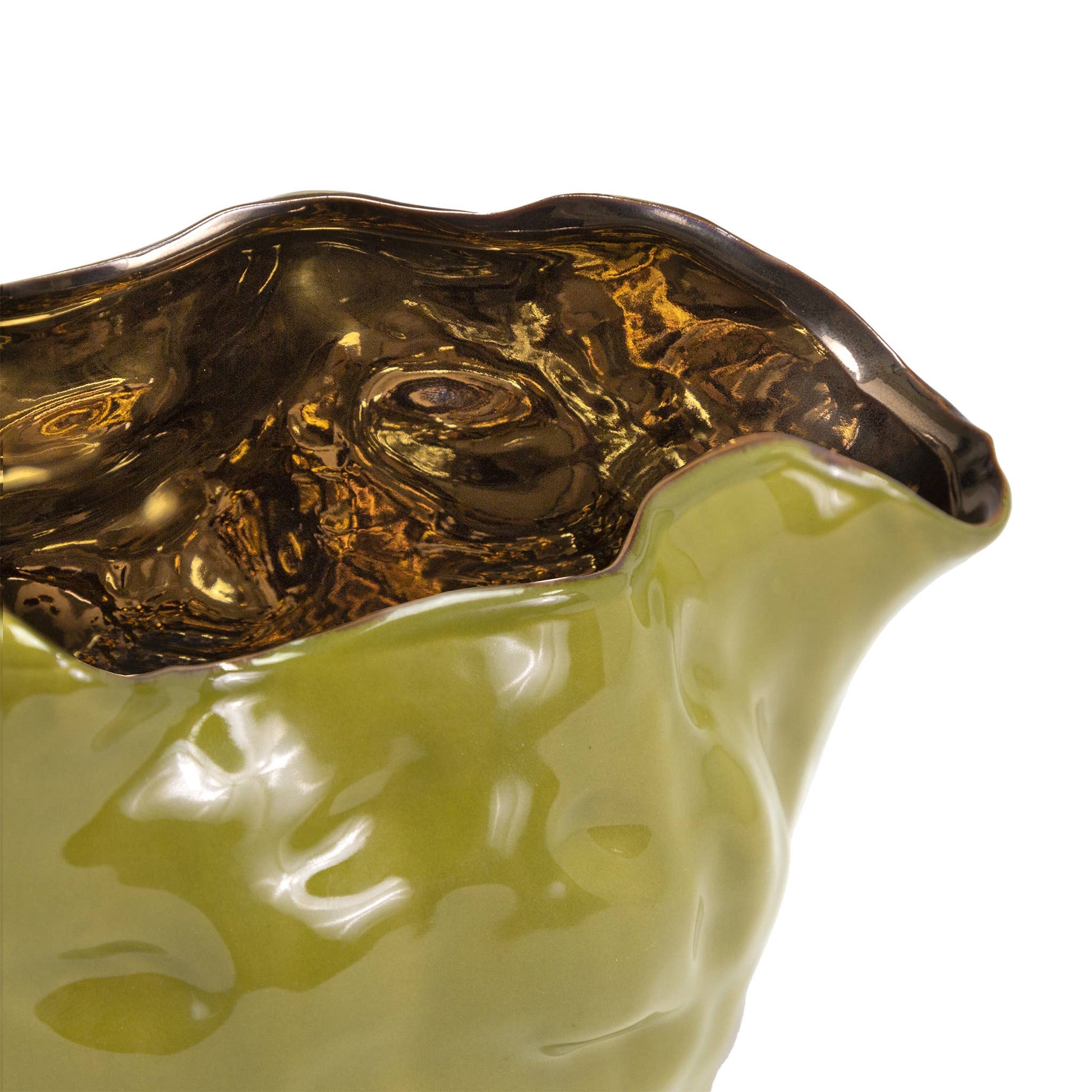 Add flair to your home decor with the exquisite Ava Bud Bowl. Made from high-quality ceramic, this decorative bowl measures 9Lx7Wx5.5H, making it a versatile piece for various display purposes. Its alluring green exterior, complemented by a bronze interior, offers a striking contrast and adds a contemporary touch to your living space. The bowl's unique wavy abstract edge and dimpled sides create an eye-catching design that is sure to impress. Use it to showcase your favorite fillers or faux plants and transform any room into a stylish haven.