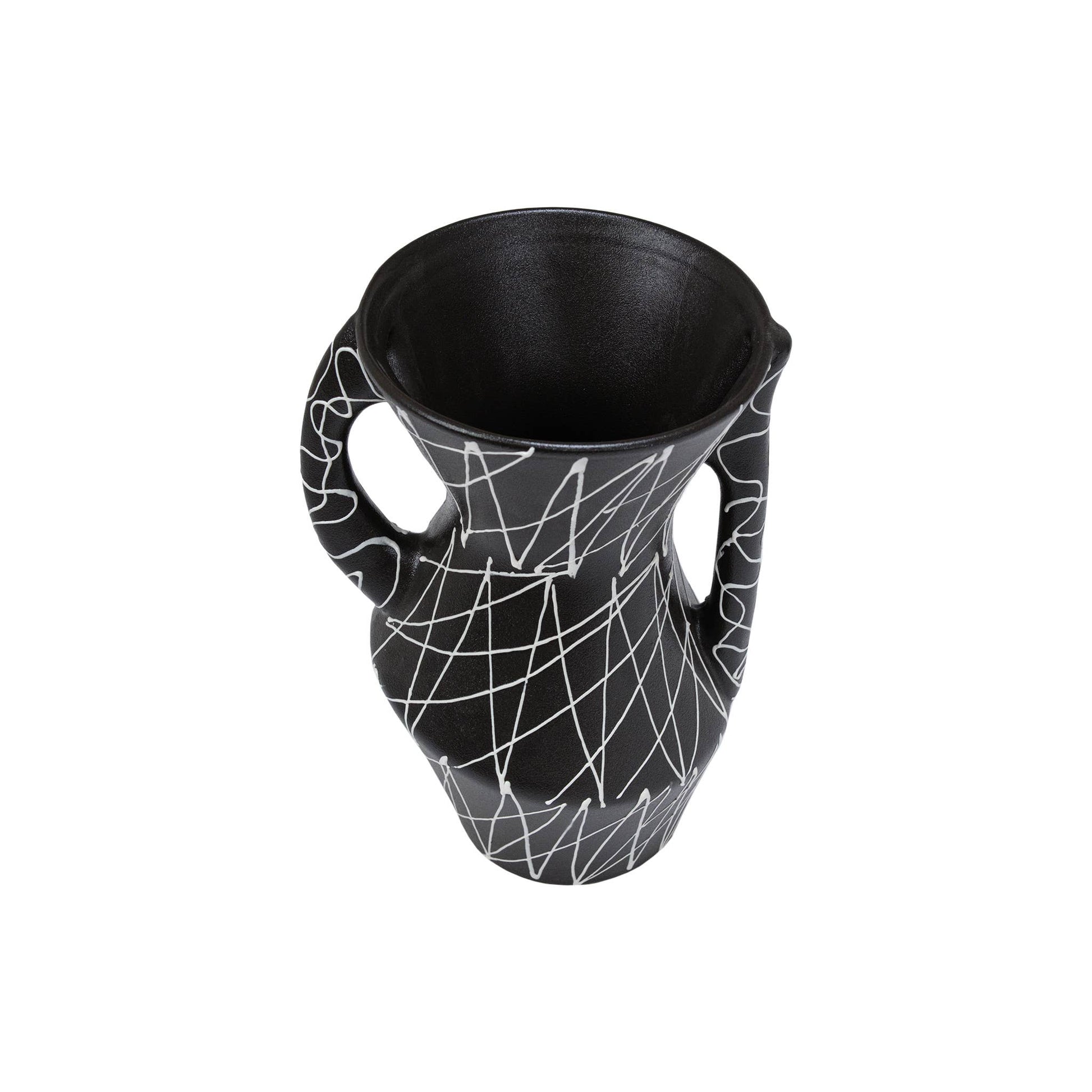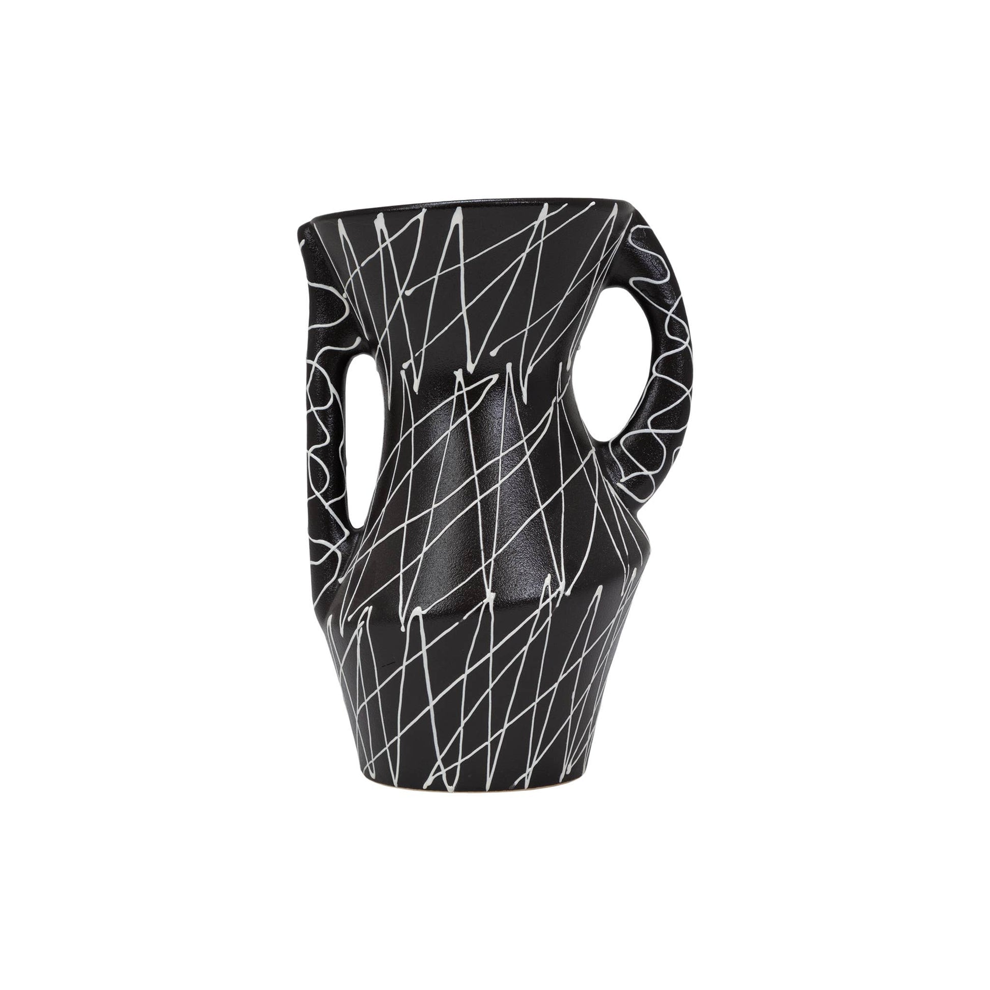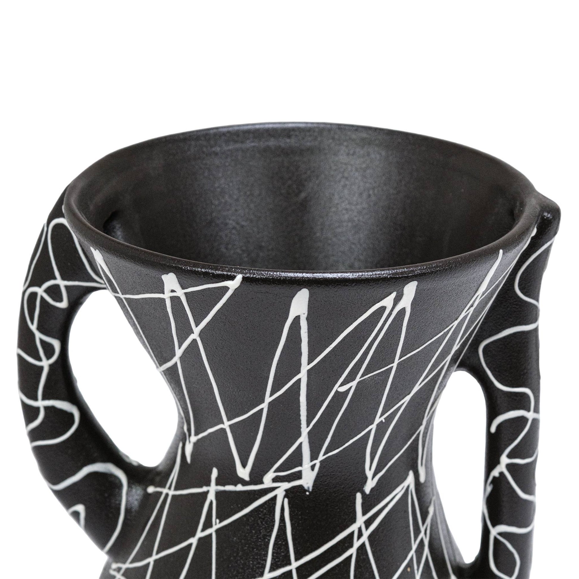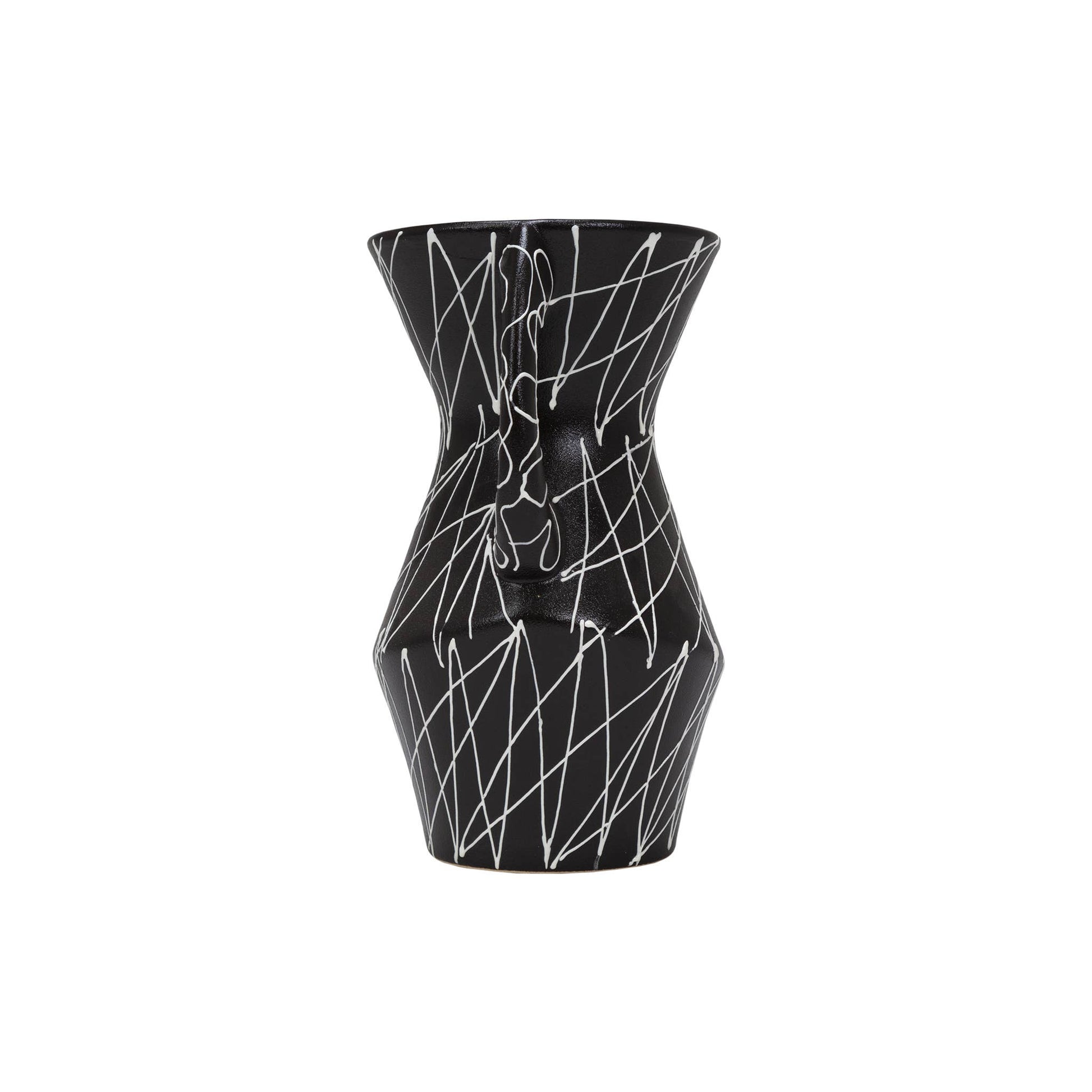 The Cazden Short Vase presents a striking blend of modern art and functional design that commands attention in any room. This contemporary ceramic masterpiece showcases intricate white linear patterns dancing across its sleek black surface, creating an eye-catching interplay of light and shadow. Standing 11 inches tall with an 8-inch width and length, this geometric vase features unique cutout details and an asymmetrical silhouette that adds architectural interest to mantels, console tables, or dining room centerpieces. Perfect for minimal decor enthusiasts and modern home interior styling, the bold contrast between the dark ceramic base and abstract white lines makes this decorative accent piece versatile enough to complement both monochromatic and colorful room designs.