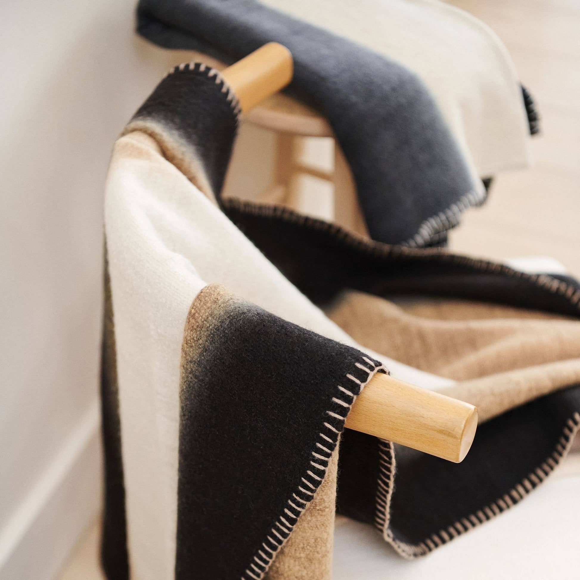 Siro Throw is a timeless piece that harmoniously drifts its beauty between white spaces and contrasting details. Our love for accentuating detailing in hem is taken one step further in this classic piece as hand stitched details are placed carefully on hand spun merino which is handwoven by weavers in Nepal.