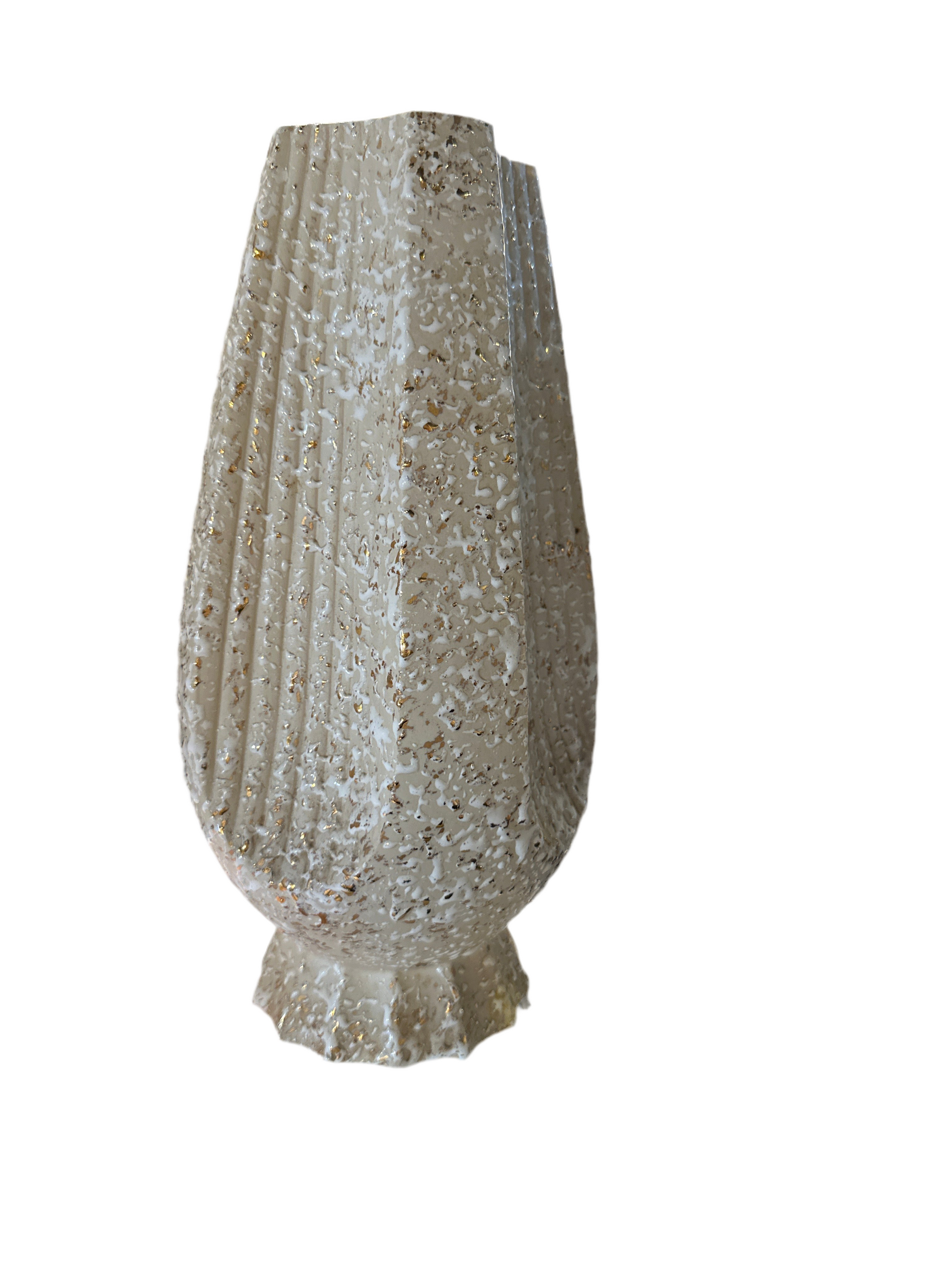 Vintage textured spackle vase with white and gold over a cream ground.