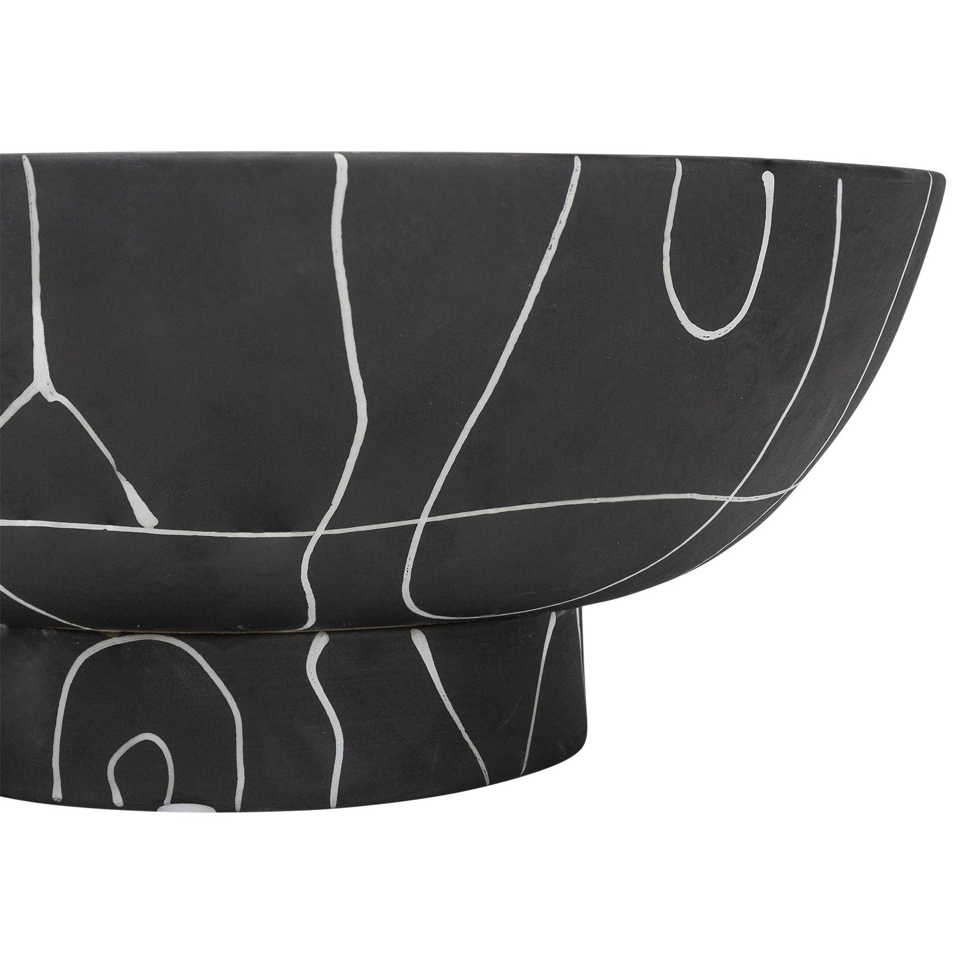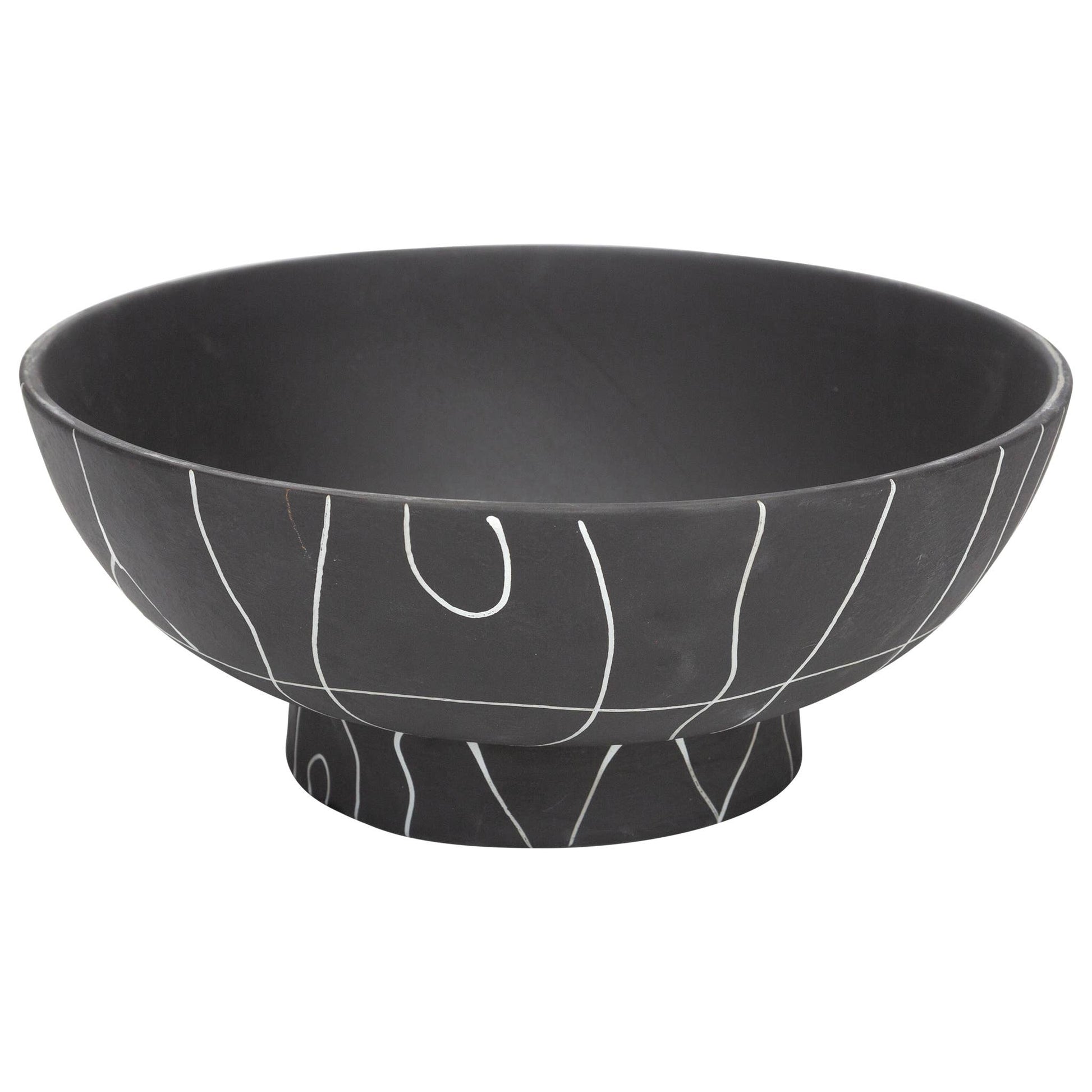Elevate your home decor with the striking Havis Bowl, a contemporary ceramic centerpiece that combines modern design with timeless elegance. This black decorative bowl features distinctive white linear patterns that create an artistic, abstract aesthetic across its surface. The generous 12-inch diameter and 5-inch height make it perfect for dining tables, console tables, or entryway displays. Its pedestal base and wide bowl shape offer versatile styling options for modern, transitional, and eclectic interiors. The bowl's sophisticated matte black finish and clean silhouette complement both minimalist and luxury decor styles. Whether used as a standalone statement piece or filled with decorative objects, this decorative ceramic bowl adds depth and visual interest to any room. The geometric pattern and artisanal craftsmanship make each piece a unique addition to your home accessories collection.