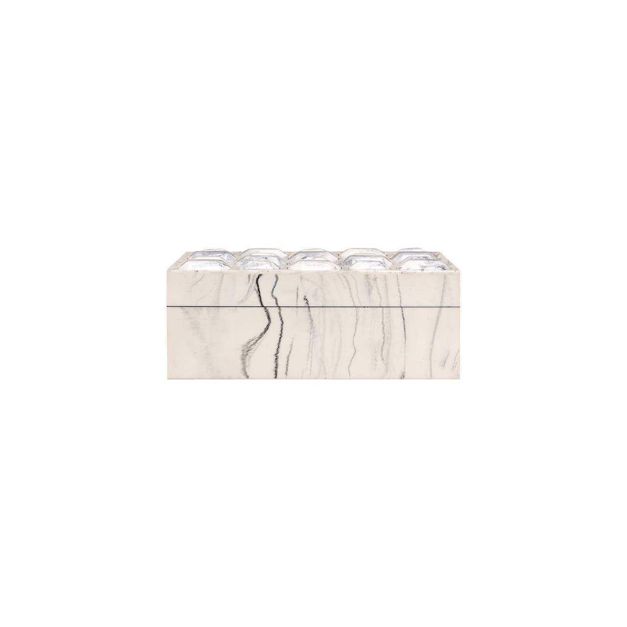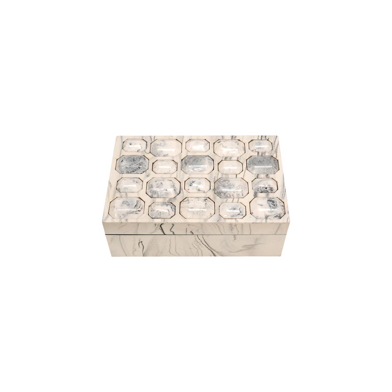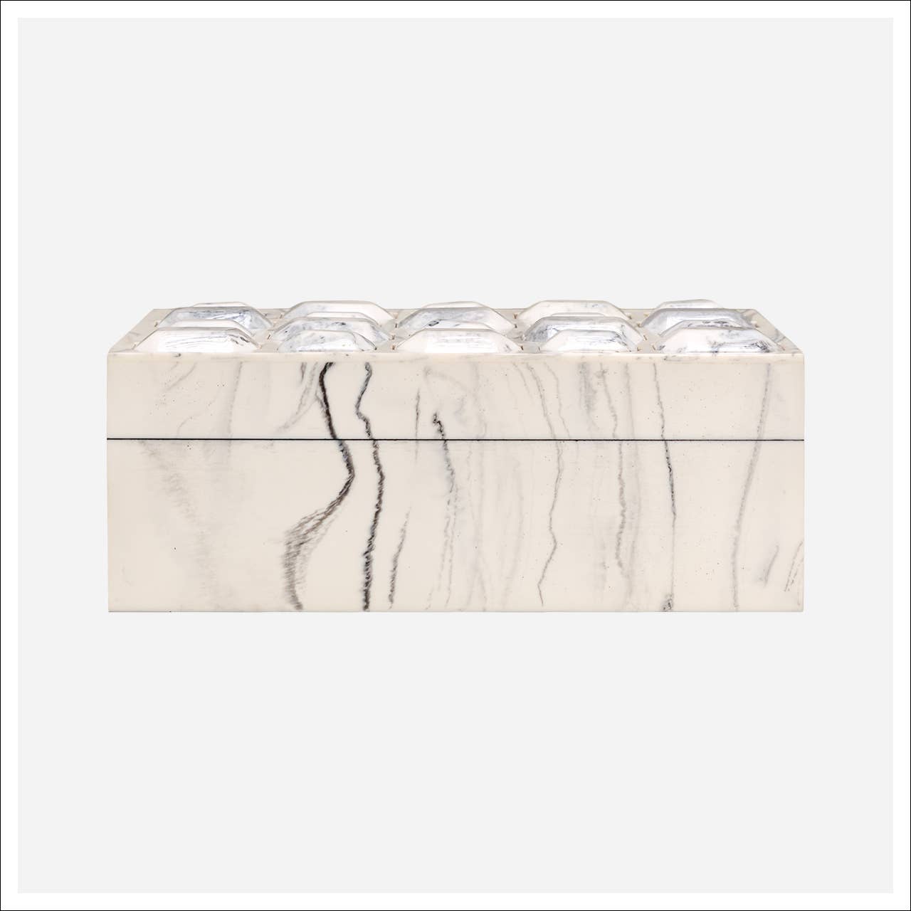 The Larana Box brings a sophisticated balance of texture, tone, and form to modern interiors. Crafted from resin, this rectangular decorative box features a marbled ivory finish with fluid black veining that adds movement and visual interest to the smooth surface. The removable lid is topped with a sculptural grid of raised domes, creating contrast between the organic pattern below and the structured detail above. Measuring 8 inches long by 5 inches wide by 3 inches high, the low-profile form makes it ideal for styling on shelves, dressers, or accent tables. Whether used to hold small accessories or simply displayed as a sculptural accent, the Larana Box offers both function and elegance. Its neutral palette and striking materiality make it a versatile choice for minimalist, transitional, or artfully curated spaces.