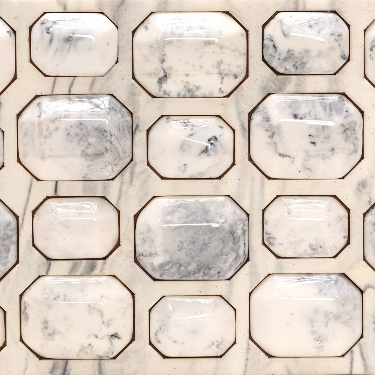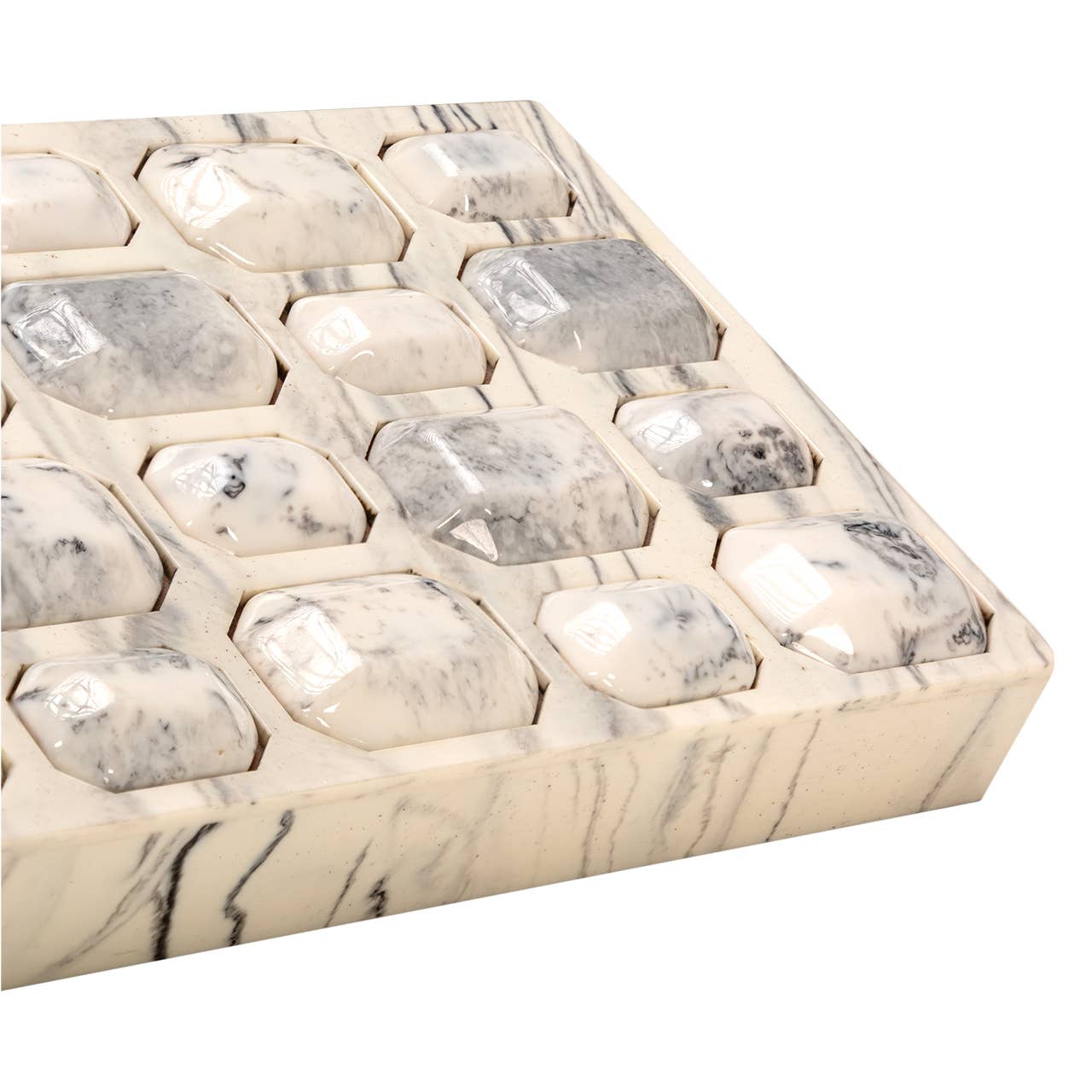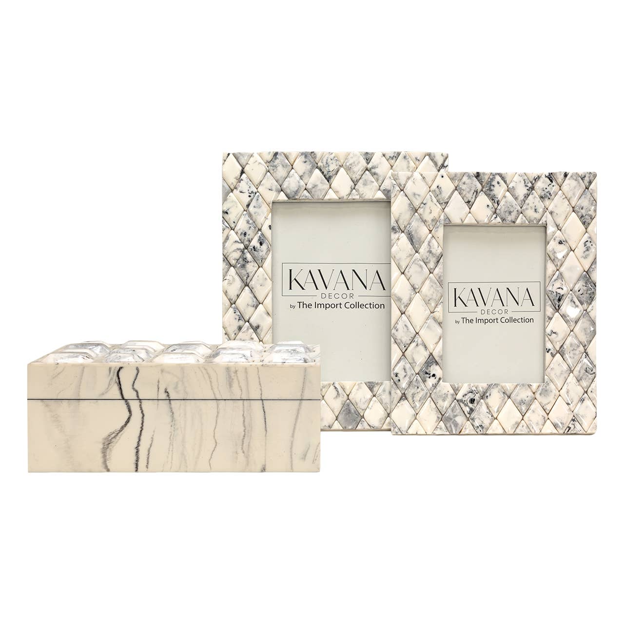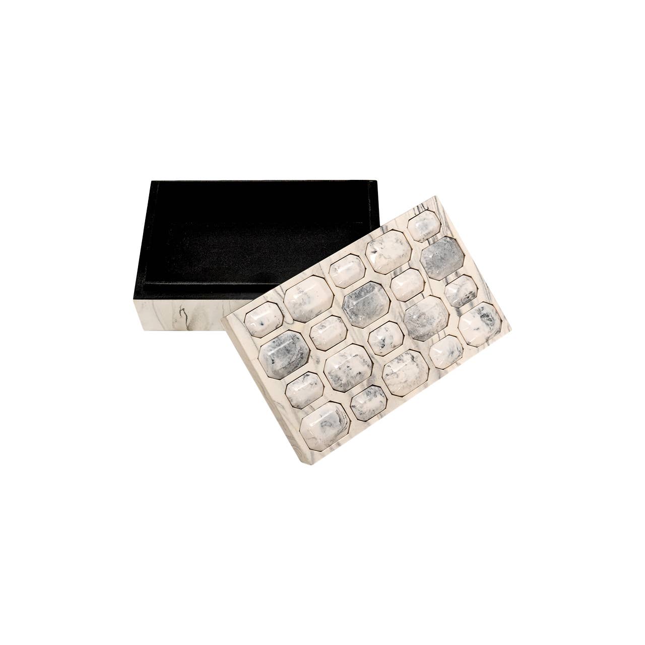The Larana Box brings a sophisticated balance of texture, tone, and form to modern interiors. Crafted from resin, this rectangular decorative box features a marbled ivory finish with fluid black veining that adds movement and visual interest to the smooth surface. The removable lid is topped with a sculptural grid of raised domes, creating contrast between the organic pattern below and the structured detail above. Measuring 8 inches long by 5 inches wide by 3 inches high, the low-profile form makes it ideal for styling on shelves, dressers, or accent tables. Whether used to hold small accessories or simply displayed as a sculptural accent, the Larana Box offers both function and elegance. Its neutral palette and striking materiality make it a versatile choice for minimalist, transitional, or artfully curated spaces.