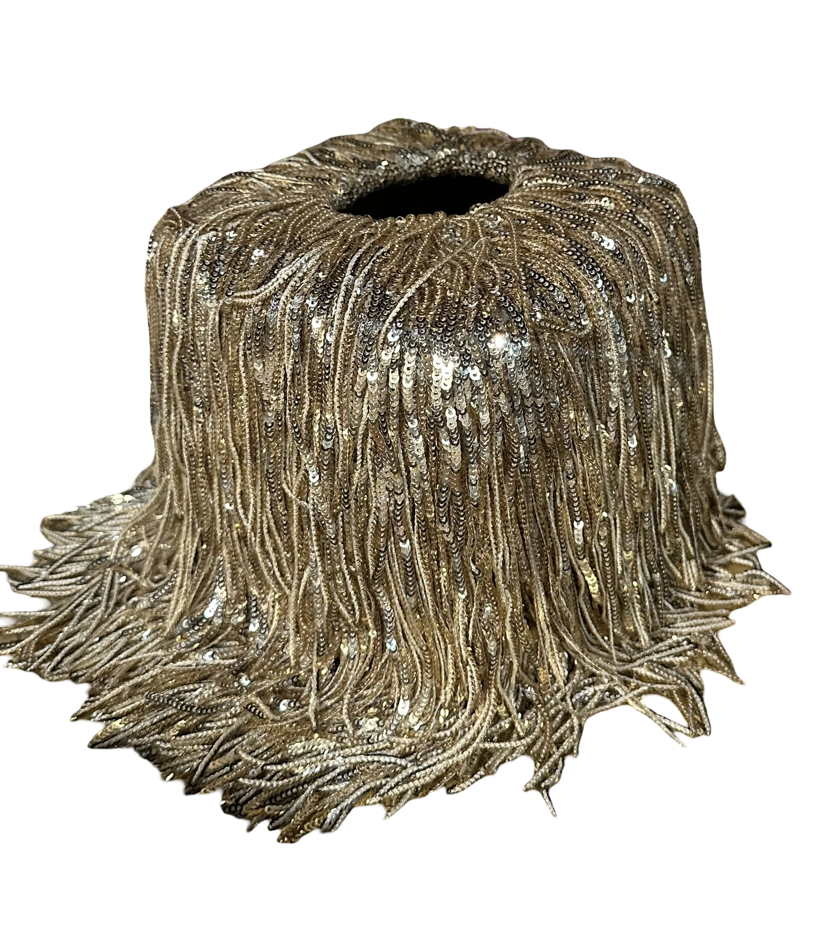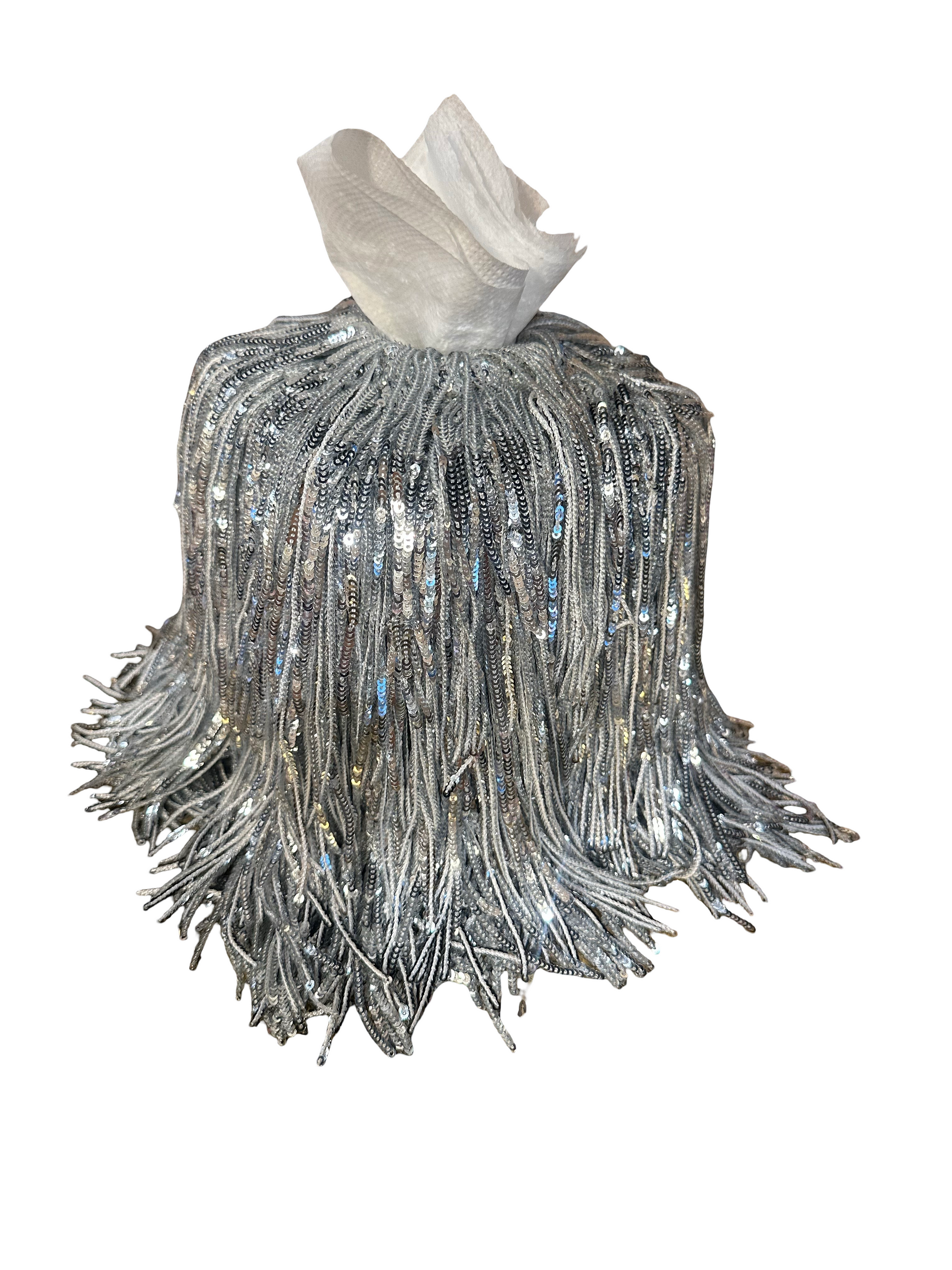 Limited Edition amazing sequin fringe tissue box by Amber Rene Hansen. Amber was inspired by New Years Eve and the glitter and glamour of the holiday season. Gold and Silver sequin fringe available.