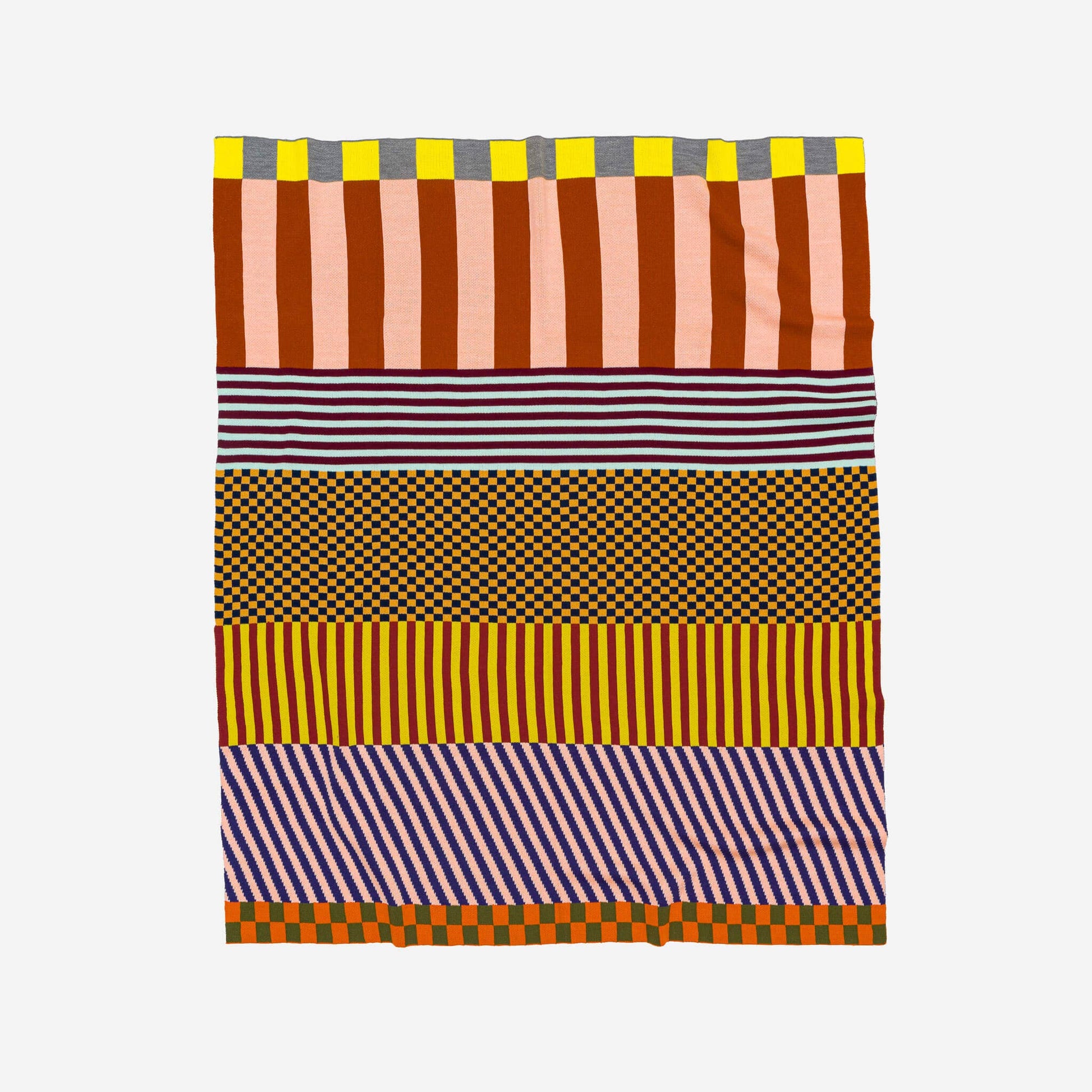 Jacquard knit throw with graphic pattern-mixing motif. Mix and match with contrasting patterns or layer with coordinating pillows, here and here, for a high-impact look. Cotton-weight for year-round use. Fully reversible. Knit with new and repurposed deadstock yarn.