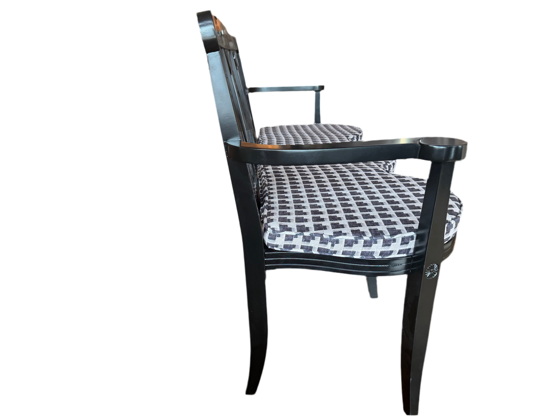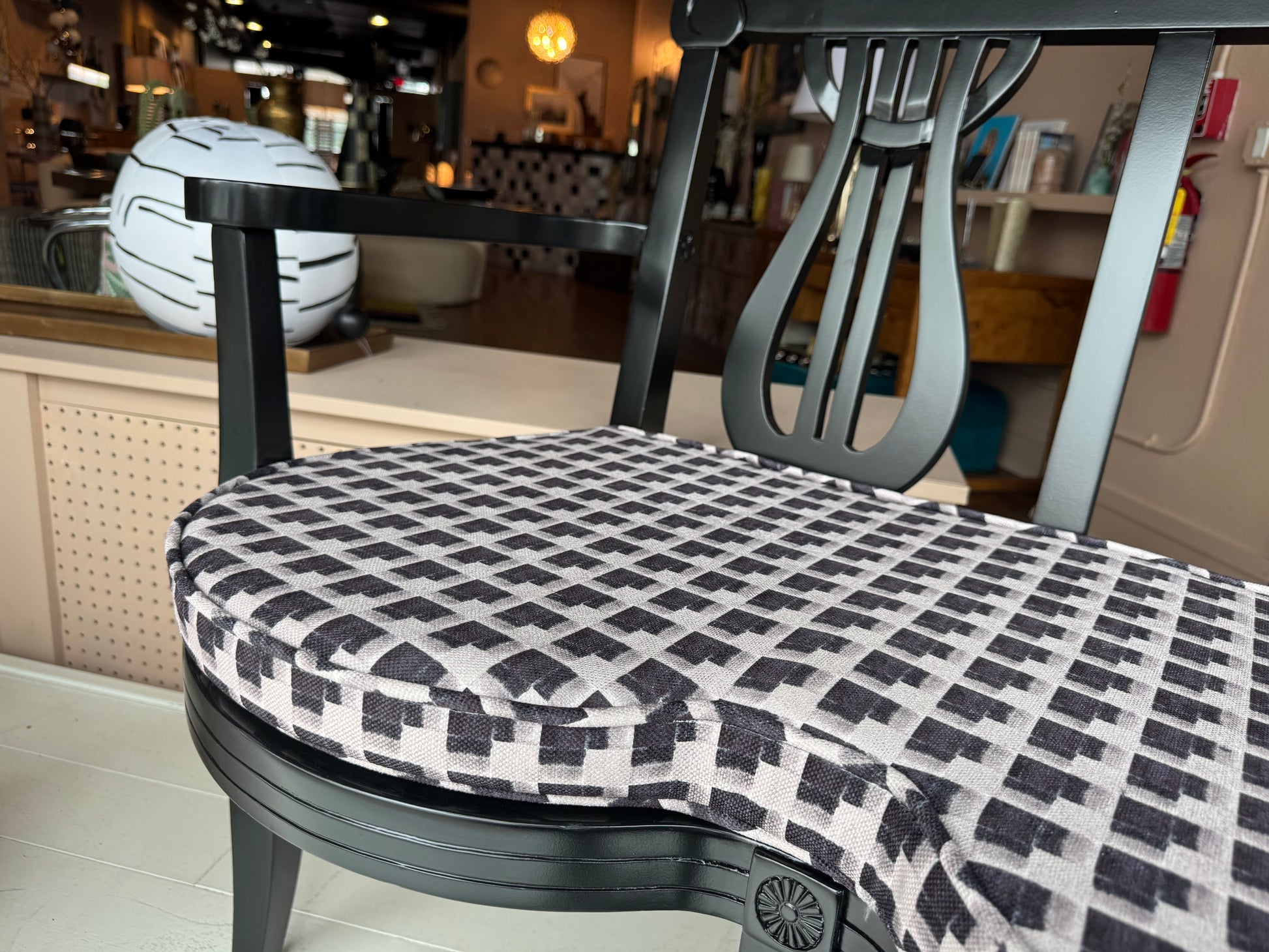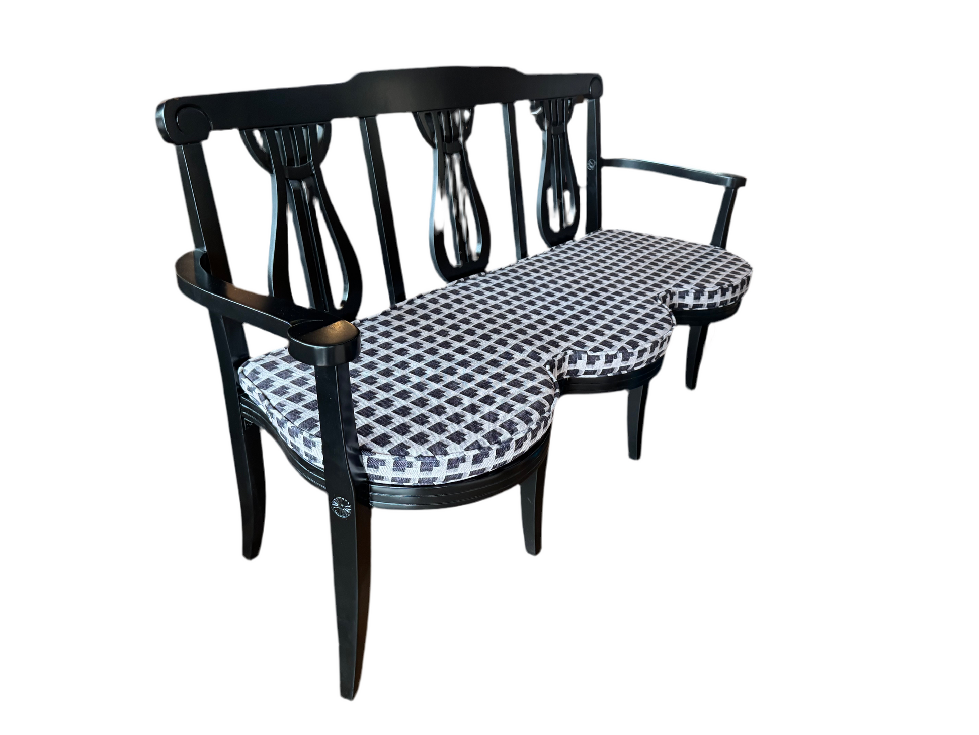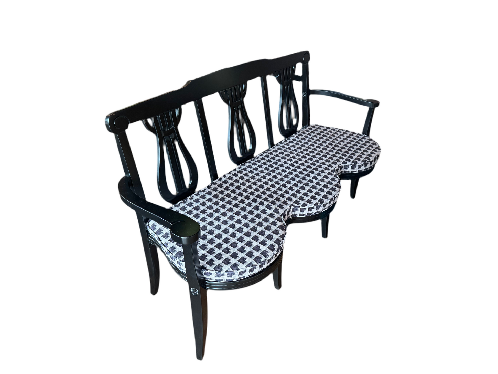 Vintage bench completely refinished and painted a satin black and finish with Stone Textile Studio Checker fabric. Our favorite part of this bench is the traditional style blended with the funky curves of the seat! The Stone Textile Studio cushion is the icing on the cake!
