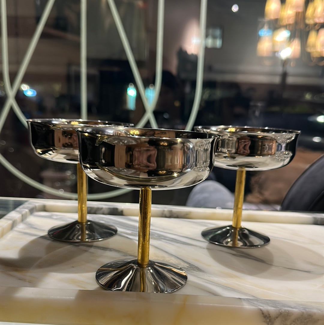 champagne coupe glasses with gold stems and silver bowls. Set of 12 polished chrome and brass champagne coupes OR chic dessert bowls with matching spoons. 4.5”h x 3.75” round. Spoons are 5.5” long.