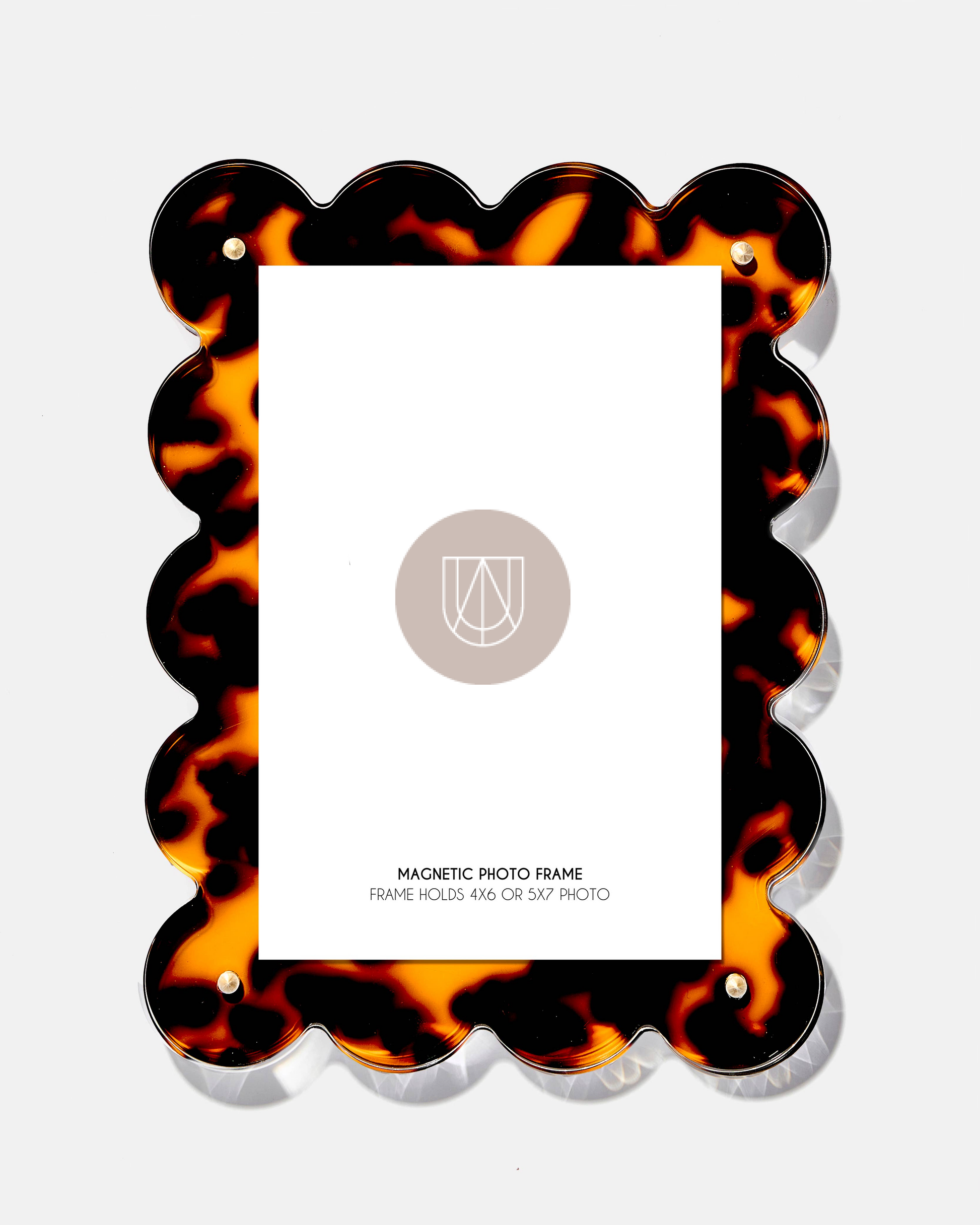 Display your favorite photos in style with this tortoise print acrylic picture frame! It features a magnetic border to securely hold your cherished pictures as well as adding a stylish touch. Perfect for giving your home a fun and unique look! 🤩