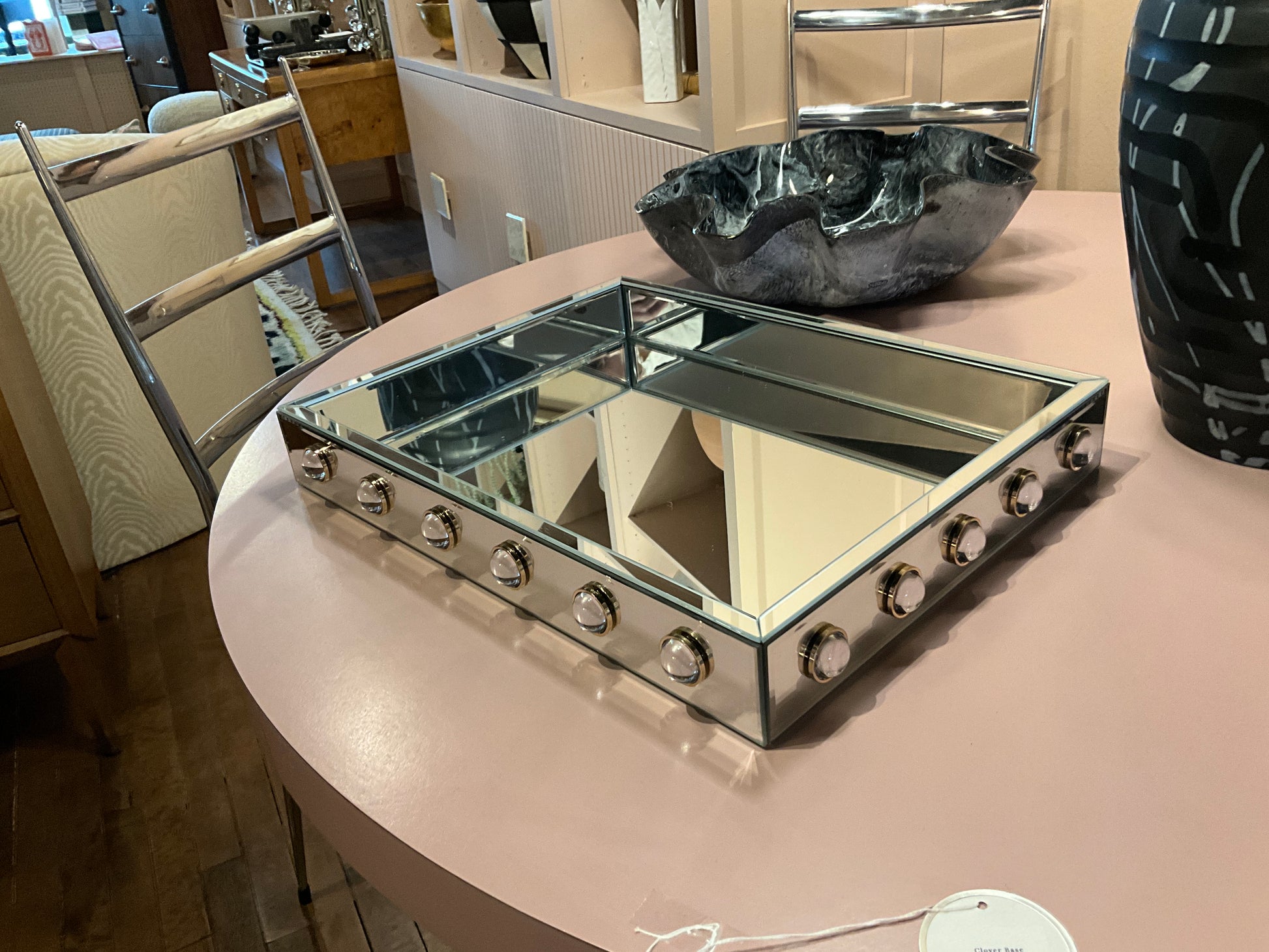 Mirrored French tray decorated with half round crystals and brass bezels.